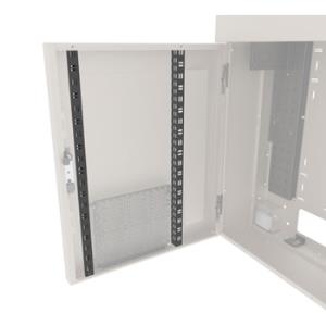 With a low-profile, patent-pending design, this pre-configured VWM Series Wall Cabinet is ideal for mounting patch panels, hubs, routers, and switches within two mounting bays or 9 total rackspaces. It includes everything needed for a simple solution, but also can support additional customization in Lever Lock™ small device mounting within the cabinet and/or on the door, thermal management, cable management and power distribution for a complete system that ensures uptime and reliability on the wall.
