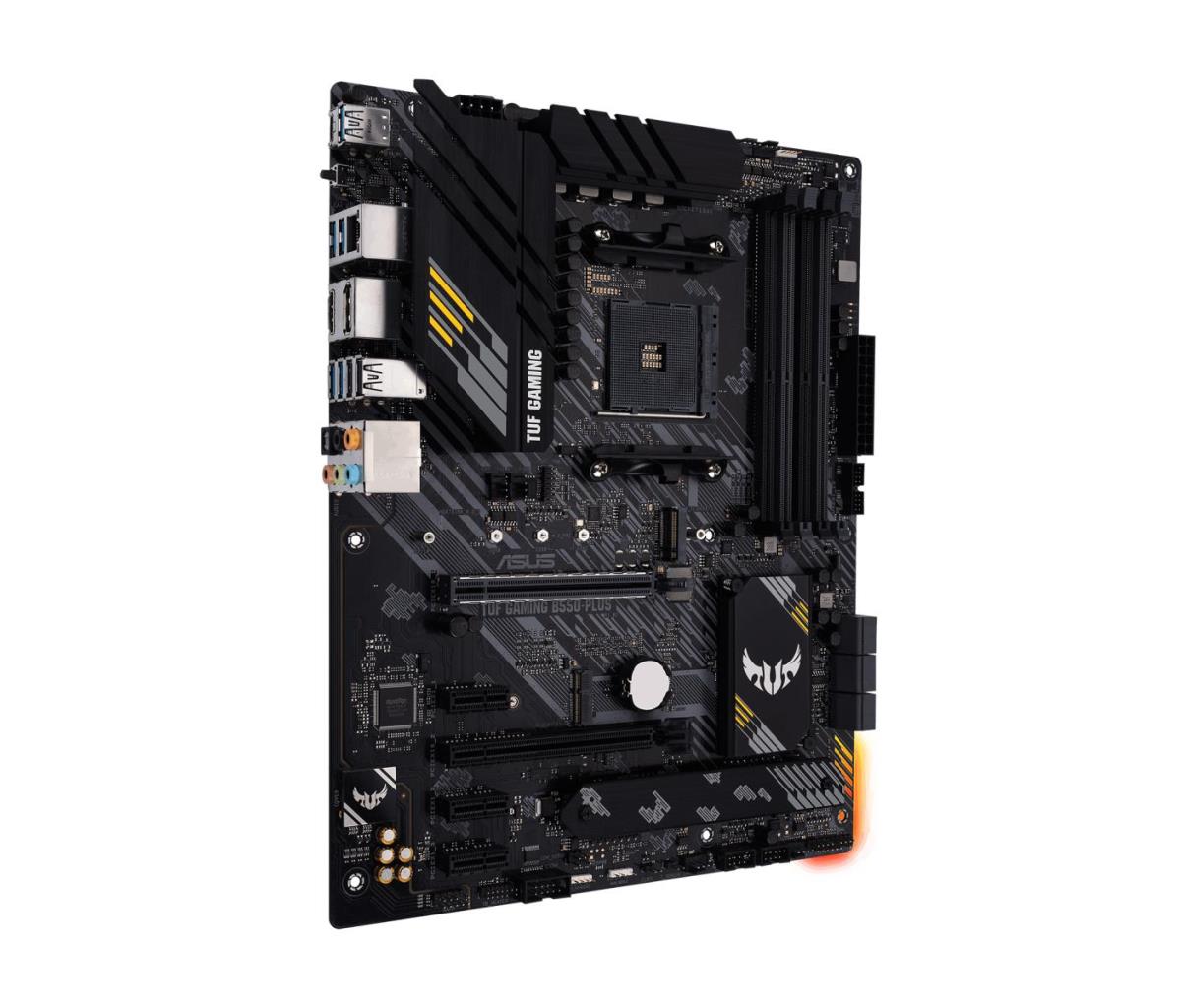 TUF Gaming B550M-Plus provides a complete, high-performance gaming package with a long list of features to improve your experience, including ultrafast networking for smoother online gameplay, pristine audio with positional cues for FPS gaming, and onboard RGB lighting that syncs with attached accessories to help you create a personalized gaming atmosphere.