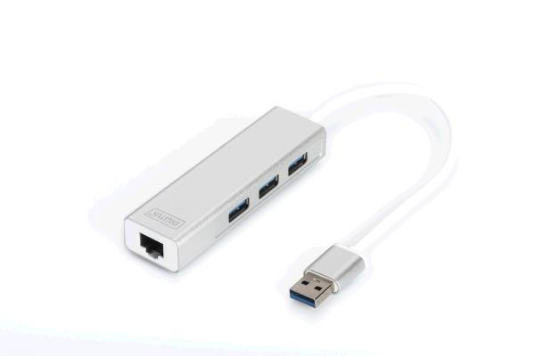 With the DIGITUS® USB 3.0 Hub & Gigabit LAN Adapter you can connect 3 additional USB 3.0 high speed devices to your Ultrabook™, notebook, subnotebook, Macbook, Macbook Air etc. Printers, hard drives, flash memory, card reader, speakers and many more devices can be easily connected via the USB interface. In addition, the adapter extends your computer to an gigabit Ethernet port and makes it networable, because nowadays the most mobile devices can only be integrated into the network via wireless LAN.