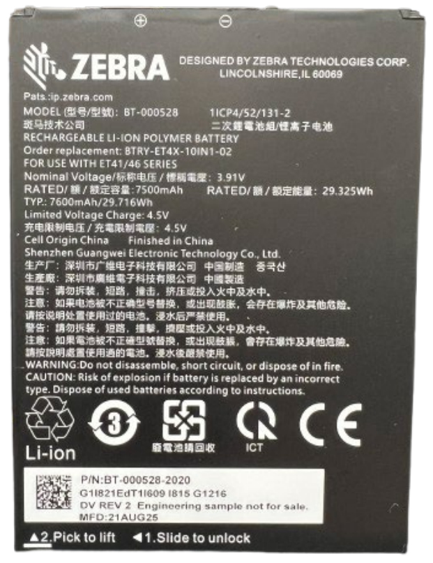 Field Replaceable Internal Battery for 10” ET401 tablets. . Rechargeable LiIon Polymer with nominal 3.91V, 7500mAh and 29.35Wh.