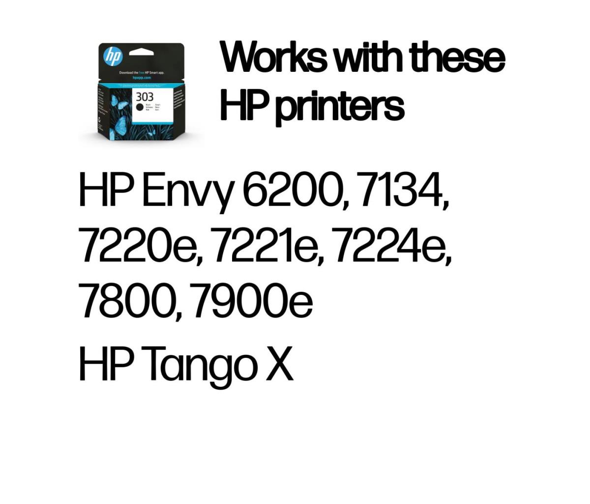 | Compatibiliteit | HP 303 inktcartridges werken met: HP Envy 6200, 7134, 7220e, 7221e, 7224e, 7800, 7900e, HP Envy Photo 7230, HP Envy Photo 7231, HP Envy Photo 7234, HP Envy Photo 7930, HP Envy Photo 7931, HP Envy Photo 7934 HP Tango X |