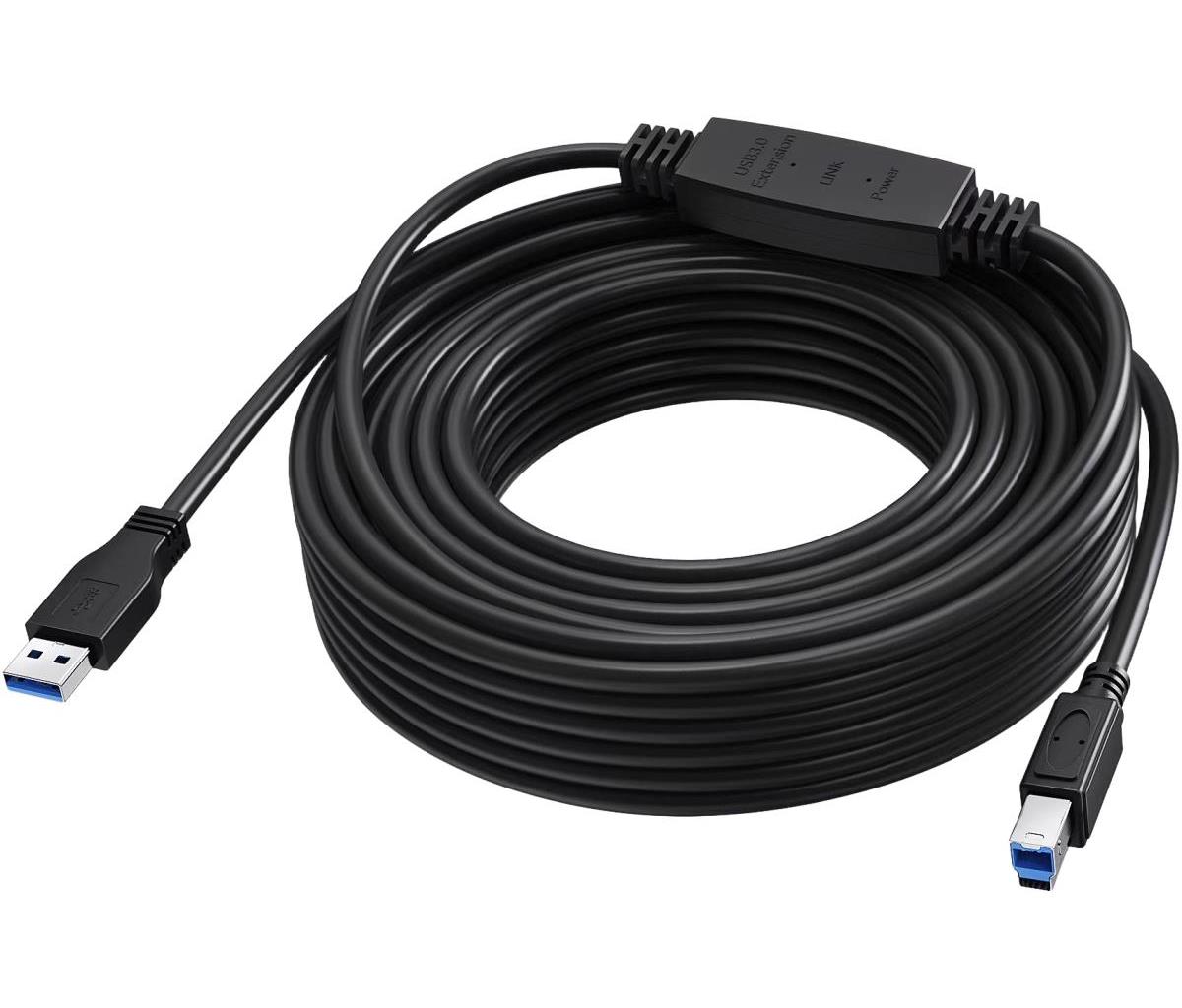 USB-A is the type of connector which plugs into your laptop. USB-B is the end that plugs into your printer. This cable has an in-line active booster half way along cable.