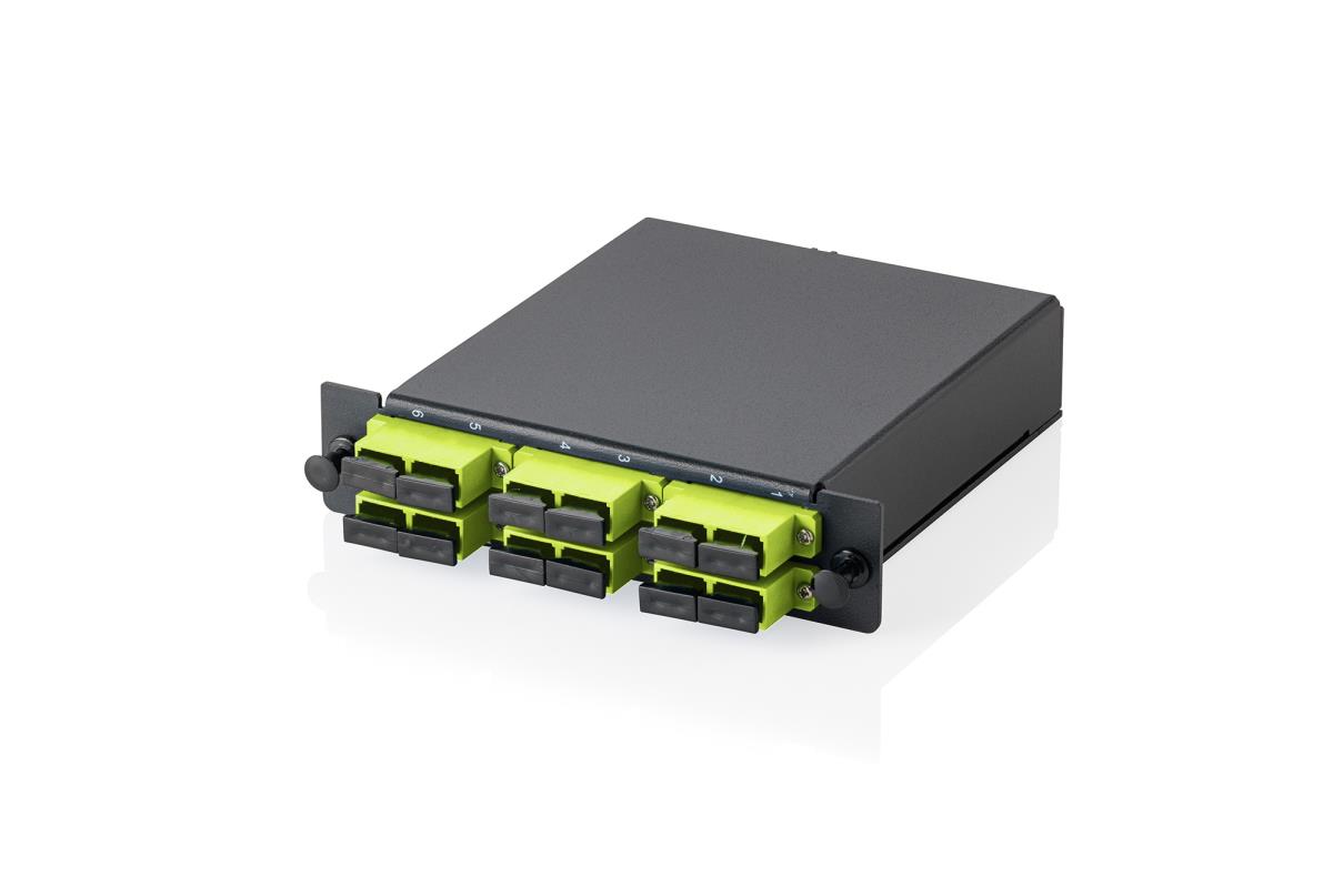 A module to simplify the deployment of high-density fiber optic networks in data centers, telecommunication networks and enterprise environments. It serves as an interface between MPO trunk cables and standard connectors such as LC, SC or other interfaces and enables seamless and organized connections. The cassette features a compact plug-and-play design and is pre-terminated to ensure low insertion loss, high performance and minimal installation time. At the rear, high fiber count backbone cables are typically connected via MPO connectors, while the front is equipped with standard connectors for direct connection to network devices.