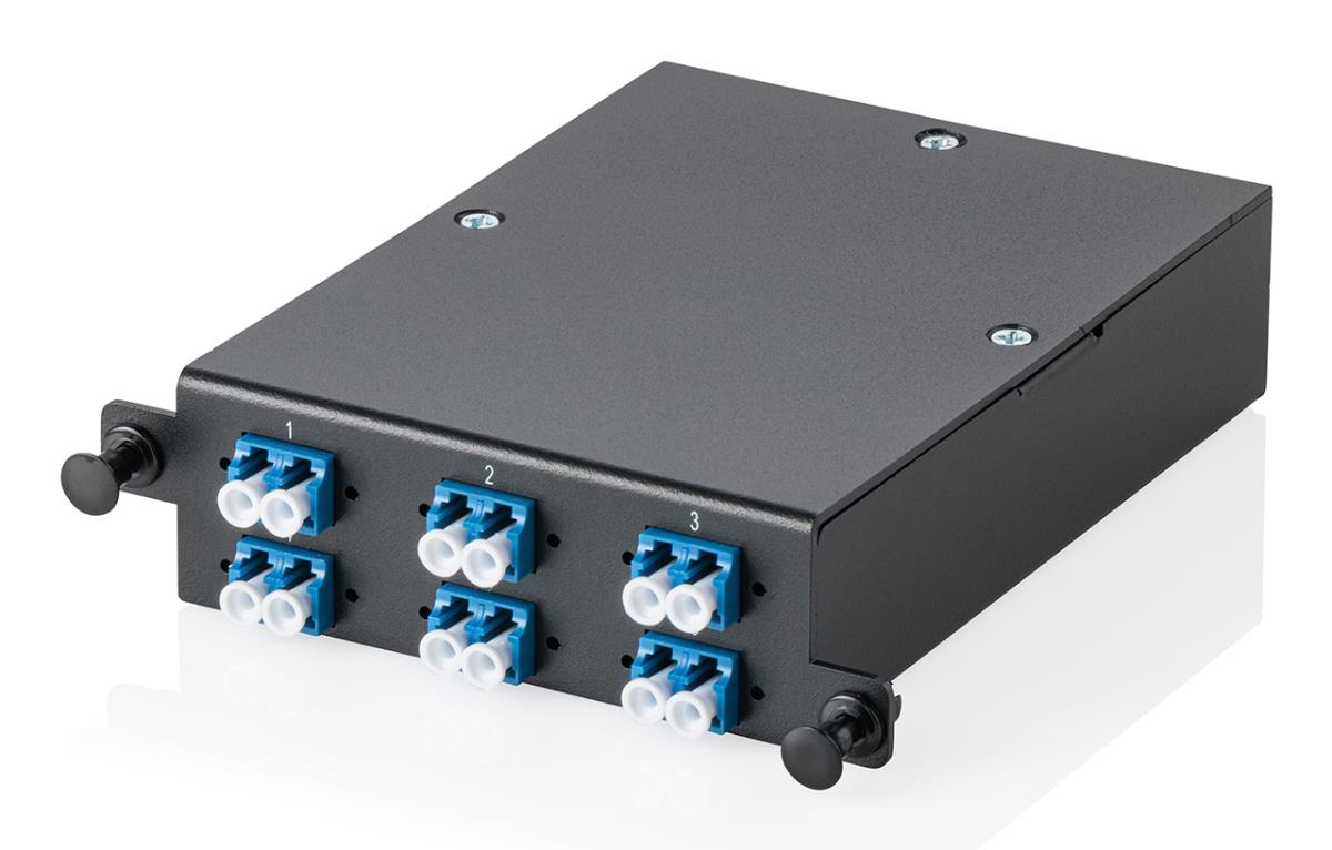 A module to simplify the deployment of high-density fiber optic networks in data centers, telecommunication networks and enterprise environments. It serves as an interface between MPO trunk cables and standard connectors such as LC, SC or other interfaces and enables seamless and organized connections. The cassette features a compact plug-and-play design and is pre-terminated to ensure low insertion loss, high performance and minimal installation time. At the rear, high fiber count backbone cables are typically connected via MPO connectors, while the front is equipped with standard connectors for direct connection to network devices.
