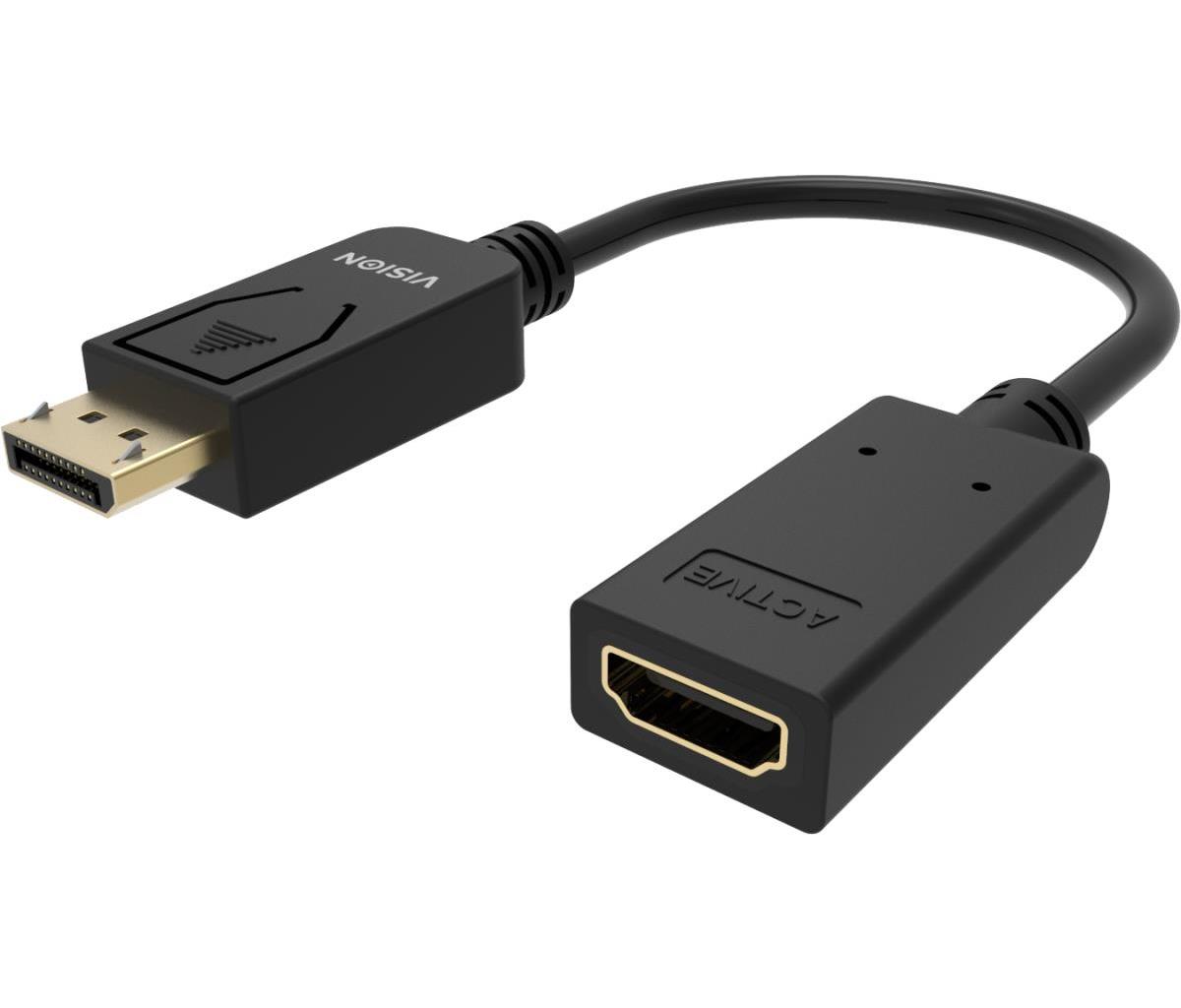 Plugs into DisplayPort and has full-sized HDMI socket. Active circuit allows PCs with or without Dual-Mode DisplayPort (DP++) to connect to displays with HDMI inputs.